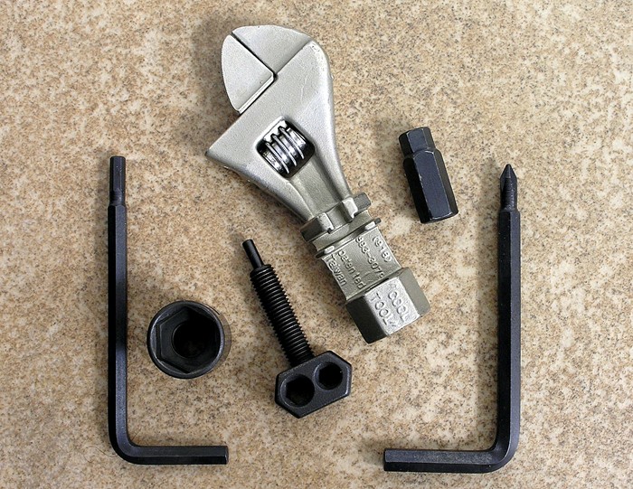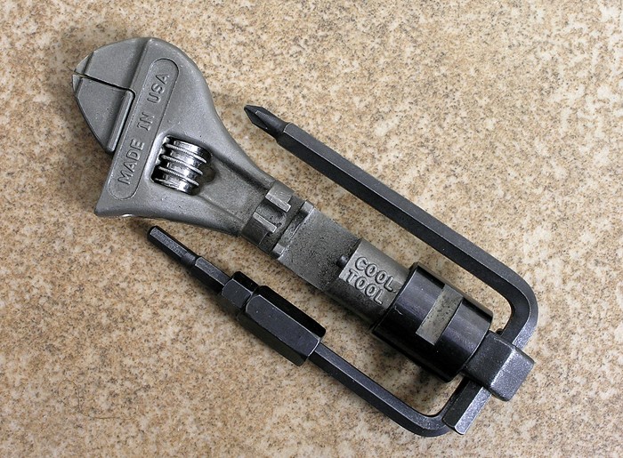 An adjustable wrench forms the basis of the Cool Tool. Its jaws open up to 11/16" (18mm) The jaws themselves are particularly narrow, allowing them to reach areas inaccessable to most wrenches.