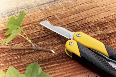 The opposite handle includes a weed cutter tool with a 3" ruler stamped on it, a Phillips screwdriver, and a grafting knife blade. The knife blade is 2-1/4" long (57mm) and has a modified sheepsfoot profile to it. On the backside of the blade is a ground section that the User's Guide refers to as a bark lifter (see picture below)