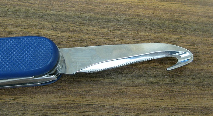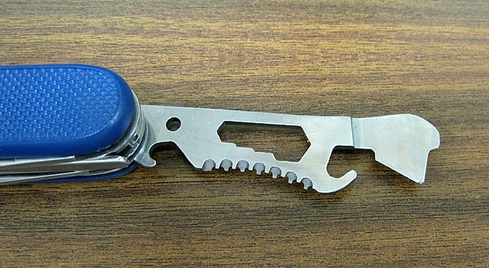 • Combination can opener/cap lifter/wood saw/with a large flathead screwdriver at the tip. Hex cutouts in this blade also allow it to be used on four different sizes of metric bolt heads.