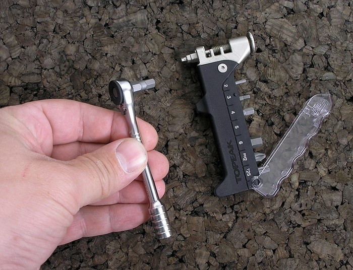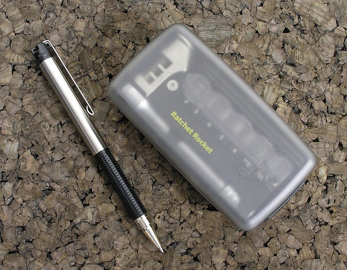The Ratchet Rocket is actually more of a "tool kit" than a single multi-purpose tool. It includes a water proof case that attaches to the bike frame. Inside there are several handy devices, the namesake being a small ratchet wrench that drives a number of included 1/4" hex bits.